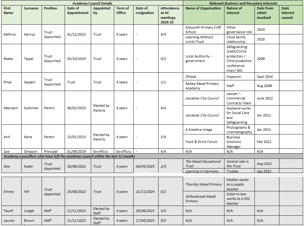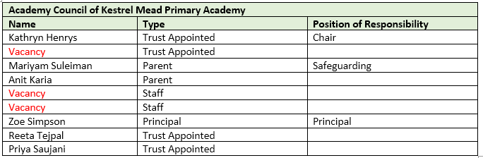 The Academy Council holds the Principal and school senior leadership team to account for the educational performance of the school and its pupils.